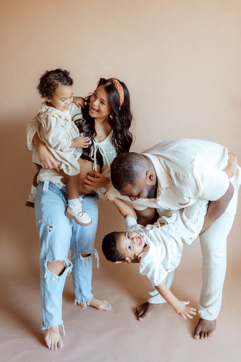 Sessions are designed to be fun and stress-free—think more play, less posing. Outdoor sessions are scheduled at golden hour, while studio sessions can be earlier in the day.